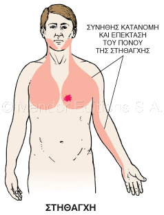 ναυτία ή εμετό, εφίδρωση, άγχος ή φόβο. Ο πόνος συνήθως δεν περιγράφεται από τους ασθενείς σαν «οξύς» ή «διαξιφιστικός» και συνήθως δεν