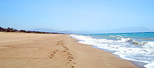 Η απεραντοσύνη που διακόπτεται μόνο από τη γραμμή του ορίζοντα, αυτή που φέρνει αυθόρμητα το χέρι στο κούτελο και προκαλεί το βλέμμα να αναζητήσει το τέλος της που δεν υπάρχει –ή δε φαίνεται, το ίδιο είναι–, η απαλή, χρυσαφένια άμμος που αντανακλά το φως του ήλιου που δε σταμάτησε ποτέ να λάμπει –πώς θα ήταν δυνατό;–, τα ιόνια νερά που βρέχουν την άκρη της και μετά τραβιούνται τόσο πίσω που μοιάζουν να σε προκαλούν να τα κυνηγήσεις.