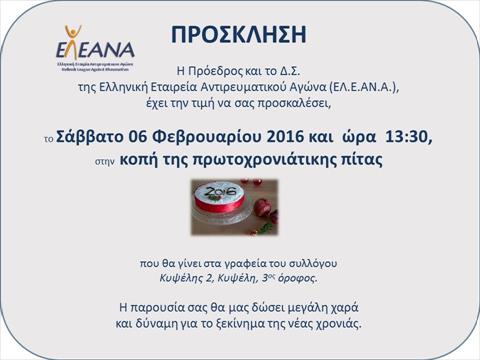 Το Διοικητικό Συμβούλιο της Ελληνική Εταιρεία Αντιρευματικού Αγώνα (ΕΛ.Ε.ΑΝ.Α.) σας προσκαλεί στην Ετήσια κοπή της πρωτοχρονιάτικης βασιλόπιτας, το Σάββατο 6 Φεβρουαρίου 2016, στις 13:30 στα γραφεία Κυψέλης 2, Κυψέλη στον 3ο όροφο.