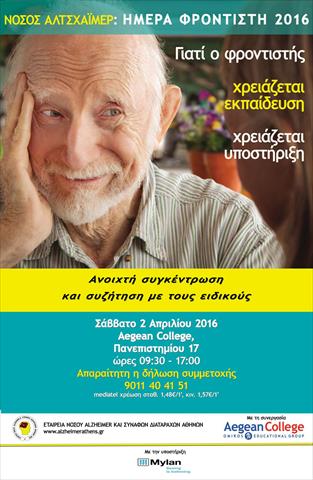Στα πλαίσια αυτά, το Σάββατο 2 Απριλίου 2016, η Εταιρεία Νόσου Alzheimer Συναφών Διαταραχών Αθηνών, διοργανώνει ανοιχτή εκδήλωση με θέμα «Η ανακούφιση του φορτίου των φροντιστών», στο Aegean College, Πανεπιστημίου 17, σε δύο επαναληπτικούς κύκλους, 09:30-13:00 για τον πρώτο και 14:00-17:00 για τον δεύτερο.