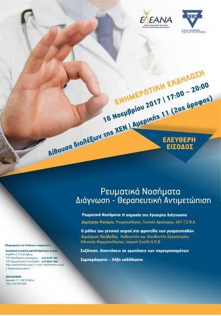Η ΕΛ.Ε.ΑΝ.Α. σας προσκαλεί στην ενημερωτική εκδήλωση με θέμα ”Ρευματικά Νοσήματα Διάγνωση - Θεραπευτική Αντιμετώπιση” που θα πραγματοποιηθεί την Πέμπτη 16 Νοεμβρίου, ώρα 17:00 - 20:00, στην αίθουσα διαλέξεων της ΧΕΝ, Αμερικής 11 (2ος όροφος).