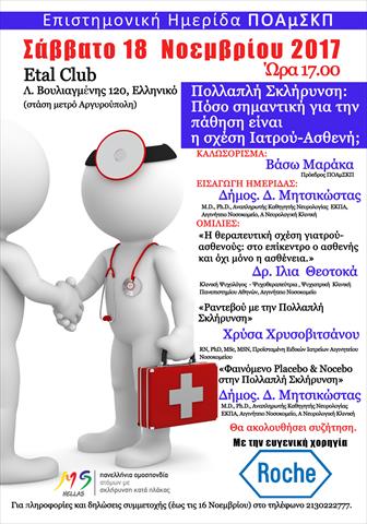 Η Πανελλήνια Ομοσπονδία Ατόμων με Σκλήρυνση Κατά Πλάκας (ΠΟΑμΣΚΠ), έχει την χαρά να σας προσκαλέσει σε Επιστημονική Ημερίδα που διοργανώνει το Σάββατο 18 Νοεμβρίου 2018, ώρα 17:00, στο Etal Club στο Ελληνικό, με θέμα «Πολλαπλή Σκλήρυνση: Πόσο σημαντική για την πάθηση είναι η σχέση ιατρού-ασθενή?».