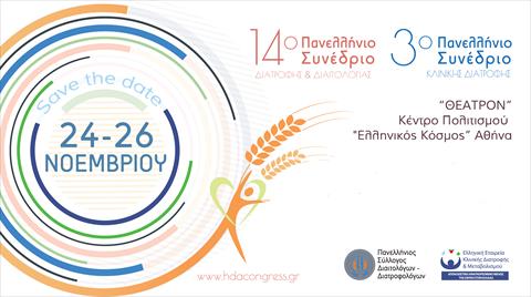 Ο Πανελλήνιος Σύλλογος Διαιτολόγων Διατροφολόγων και η Ελληνική Εταιρεία Κλινικής Διατροφής και Μεταβολισμού (GrESPEN) με ιδιαίτερη τιμή ανακοινώνουν τη διεξαγωγή του 14ου Πανελληνίου Συνεδρίου Διατροφής -Διαιτολογίας και του 3ου Πανελληνίου Συνεδρίου Κλινικής Διατροφής Μεταβολισμού, τα οποία θα πραγματοποιηθούν στις 24 ως 26 Νοεμβρίου 2017, στο «Θέατρον» του Κέντρου Πολιτισμού «Ελληνικός Κόσμος».