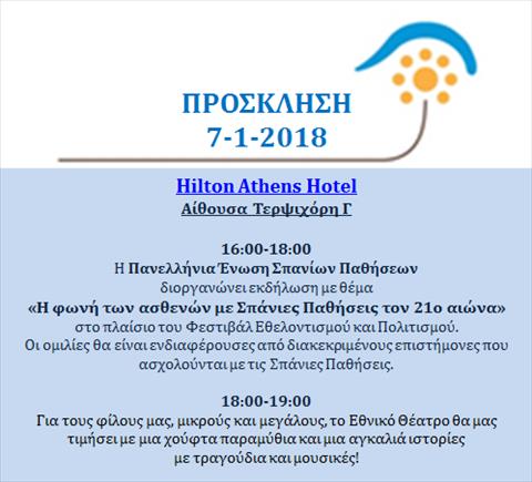Σας προσκαλούμε στην εκδήλωση με θέμα «Η φωνή των ασθενών με Σπάνιες Παθήσεις τον 21ο αιώνα», που διοργανώνει η Πανελλήνια Ένωση Σπανίων Παθήσεων, η οποία θα πραγματοποιηθεί την Κυριακή 7 Ιανουαρίου 2018 και ώρες 16:00-19:00 στο Ξενοδοχείο HILTON (αίθουσα ΤΕΡΨΙΧΟΡΗ Γ), στο πλαίσιο του Φεστιβάλ Εθελοντισμού και Πολιτισμού 2018.