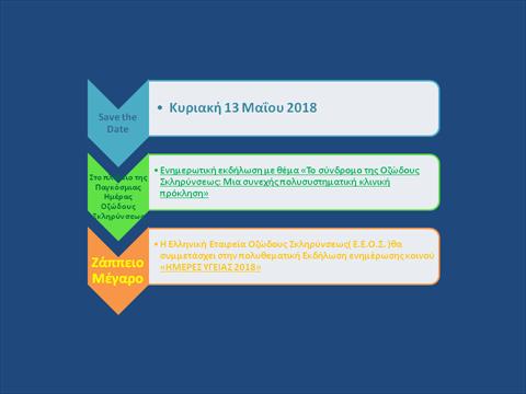 Θα θέλαμε να σας ενημερώσουμε ότι η Ε.Ε.Ο.Σ. θα συμμετάσχει στην πολυθεματική Εκδήλωση ενημέρωσης κοινού «ΗΜΕΡΕΣ ΥΓΕΙΑΣ 2018», που διοργανώνεται από την Ελληνική Εταιρεία Μελέτης Εφαρμογών Πληροφορικής Υγείας (ΕΕΜΕΠΥ) και θα πραγματοποιηθεί στο Ζάππειο Μέγαρο στην Αθήνα, στις 11, 12 και 13 Μαΐου 2018.