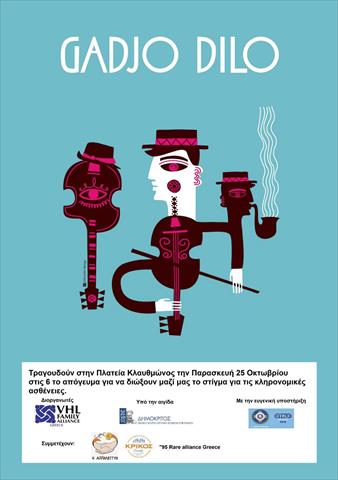 Την Παρασκευή 25 Οκτωβρίου στις 18.00 μμ, θα πραγματοποιηθεί στην πλατεία Κλαυθμώνος με την στήριξη του Δήμου Αθηναίων και του ΟΠΑΝΔΑ συναυλία του δημοφιλούς συγκροτήματος GADJO DILO με στόχο την ευαισθητοποίηση και την ενημέρωση γύρω από το στίγμα των κληρονομικών ασθενειών και της νόσου VHL (Von Hippel-Lindau).