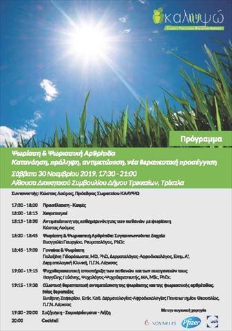 «Ψωρίαση Ψωριασική Αρθρίτιδα: Κατανόηση, πρόληψη, αντιμετώπιση, νέα θεραπευτική προσέγγιση» πραγματοποιεί το Σωματείο Υποστήριξης Ασθενών με Ψωρίαση «ΚΑΛΥΨΩ» το Σάββατο 30 Νοεμβρίου 2019 και ώρες 17:30-20:30 στην Αίθουσα Διοικητικού Συμβουλίου Δήμου Τρικκαίων με την χορηγία των εταιρειών Novartis,Pfizer και UCB.