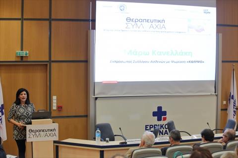 Στα πλαίσια της ημερίδας που διοργάνωσε με ιδιαίτερη επιτυχία η Θεραπευτική Συμμαχία και στην ενότητα ’Παρουσίαση Καλών Πρακτικών ενδυνάμωσης της συνεργασίας ιατρού-ασθενή’ η Μάρω Κανελλάκη, μέλος του Καλυψώ, παρουσίασε τη προσωπική της εμπειρία από τη σχέση της με τους θεράποντες ιατρούς που κατά καιρούς την παρακολούθησαν στο θέμα της ψωρίασης. Με σαφήνεια αλλά και με ξεκάθαρη τοποθέτηση έδωσε το στίγμα των αναγκών των ασθενών που ζητούν κάτι παραπάνω από τον θεράποντα ιατρό τους, πέραν της συνταγογράφησης και της τυπικής σχέσης ιατρού-ασθενούς, ιδιαίτερα σε ασθένειες που αποτελούν κάτι περισσότερο από ένα απλό δερματικό νόσημα, όπως η ψωρίαση.