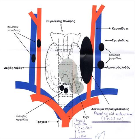 ΧΕΙΡΟΥΡΓΙΚΗ ΕΠΕΜΒΑΣΗ-ολική θυρεοειδεκτομή με ταυτόχρονη παραθυρεοειδεκτομή (εκτομή γιγάντιου αδενώματος παραθυρεοειδούς). Ο παθολογικός παραθυρεοειδής αδένας δεν διηθεί παρακείμενους ιστούς (κλινική διαφορική διάγνωση από καρκίνο θυρεοειδούς)