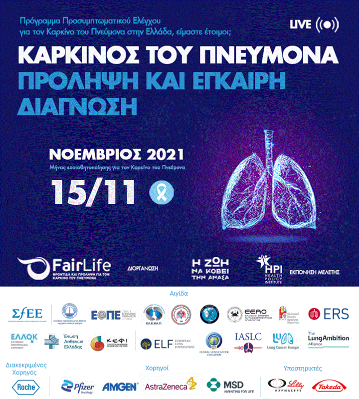 «Καρκίνος του Πνεύμονα – πρόληψη και έγκαιρη διάγνωση : Πρόγραμμα Προσυμπτωματικού Ελέγχου για τον Καρκίνο του Πνεύμονα στην Ελλάδα, είμαστε έτοιμοι;» είναι ο τίτλος της διαδικτυακής ημερίδας που διοργανώνει η FairLife LCC, τη Δευτέρα 15 Νοεμβρίου 2021. Την εκδήλωση συντονίζει και παρουσιάζει η κ. Ελενα Παπαδημητρίου, δημοσιογράφος.