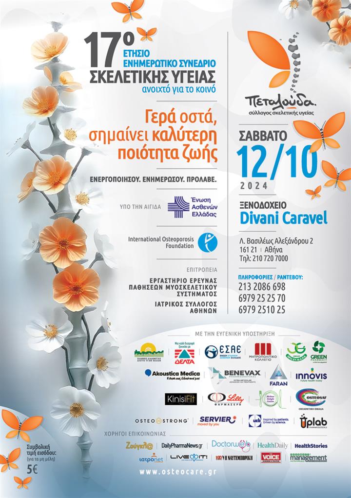 Όπως κάθε χρόνο έτσι και φέτος ο Σύλλογος Πεταλούδα σκοπεύει να γιορτάσει την Παγκόσμια Ημέρα Οστεοπόρωσης υλοποιώντας το 17ο ετήσιο ενημερωτικό Συνέδριο, το Σάββατο 12 Οκτωβρίου 2024, στο ξενοδοχείο Divani Caravel.
