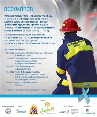 Ο όμιλος Εθελοντών κατά του Καρκίνου «Αγκαλιάζω» σε συνεργασία με το Πυροσβεστικό Σώμα ξεκινάει Καμπάνια ενημέρωσης για πρόληψη – έγκαιρη διάγνωση του Καρκίνου του Προστάτη στις 29 και 30 Μαρτίου 2014 στη Θεσσαλονίκη.