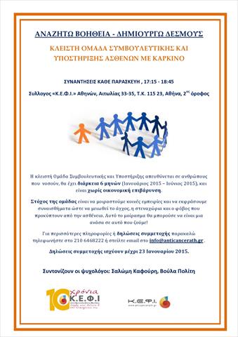 Ο Σύλλογος Καρκινοπαθών-Εθελοντών-Φίλων-Ιατρών ”Κ.Ε.Φ.Ι”. Αθηνών σε συνεργασία με τις Ψυχολόγους συνεργάτιδες Σαλώμη Καφούρη και Βούλα Πολίτη, στο πλαίσιο της στήριξης ασθενών με καρκίνο, ξεκινά στις 30 Ιανουαρίου την Κλειστή Ομάδα Συμβουλευτικής Υποστήριξης Ασθενών με Καρκίνο για τους ασθενείς και επιθυμούν να μετέχουν σε έναν εξάμηνο κύκλο συναντήσεων με στόχο το μοίρασμα κοινών εμπειριών και συναισθημάτων και την ανακούφισή τους, ιδιαίτερα σε μια εποχή που χρειάζεται να ανταπεξέλθουμε στα σημάδια της ψυχικής κατάρρευσης και της κοινωνικής παραίτησης.