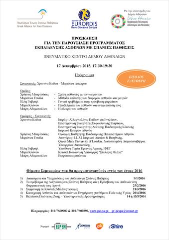 Η Πανελλήνια Ένωση Σπανίων Παθήσεων διοργανώνει πρόγραμμα σεμιναρίων για την εκπαίδευση ασθενών με Σπάνιες Παθήσεις.