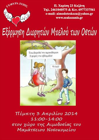 Ο Σύλλογος Εθελοντών Αιμοδοτών Κοζάνης ”Γέφυρα Ζωής’ διοργανώνει τη ”2η εξόρμηση δωρητών μυελού των οστών’, την Πέμπτη 3 Απριλίου 2014 στο Τμήμα Αιμοδοσίας του Μαμάτσειου Νοσοκομείου, από τις 11.00 - 14.00.