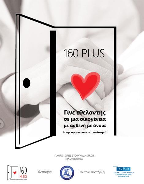 To πρόγραμμα 160 plus ξεκίνησε τη λειτουργία του το Φεβρουάριο του 2016, με αποκλειστική δωρεά από το Ίδρυμα Σταύρος Νιάρχος (www.SNF.org) και έχει διάρκεια 2 χρόνια. Στόχος είναι να ωφεληθούν 160 και περισσότερες οικογένειες που ζουν στο Δήμο Αθηναίων μέσω μιας πολυκλαδικής ομάδας παρέμβασης, η οποία θα προσφέρει δωρεάν ολοκληρωμένη και εξειδικευμένη διαχείριση της νόσου του Alzheimer και των συνεπειών της σε ασθενή και φροντιστή κατ’ οίκον.