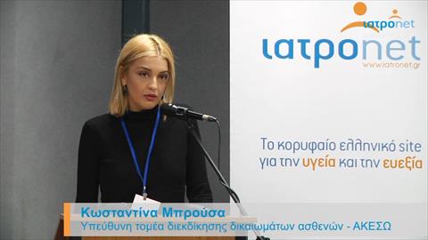 Τις διεθνείς συμβάσεις και την χάρτα των δικαιωμάτων των ασθενών, παρουσίασε στην έβδομη ημερίδα του iatronet.gr ”Βήματα Ασθενών” η υπεύθυνη διεκδίκησης δικαιωμάτων ασθενών του Πανελλήνιου Συλλόγου Ασθενών με Αυτοάνοσα Ρευματικά Νοσήματα «ΑΚΕΣΩ», Κωνσταντίνα Μπρούσα.