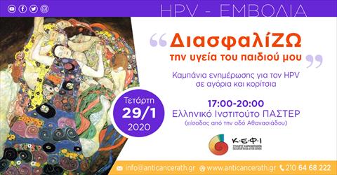 Για το λόγο αυτό διοργανώνει Ημερίδα ενημέρωσης στο Ελληνικό Ινστιτούτο ΠΑΣΤΕΡ την Τετάρτη 29 Ιανουαρίου 2020 και ώρα 17:00-21:00. Σύμμαχοι στον αγώνα αυτό είναι οι γιατροί ογκολόγοι- γυναικολόγοι που θα μας ενημερώσουν για τα εμβόλια, σε ποιους απευθύνονται, τη σπουδαιότητα να εμβολιάζονται και τα δύο φύλα, που οφείλεται ο ιός πριν χρειαστεί να φτάσουμε στο ερώτημα πώς αντιμετωπίζετε.