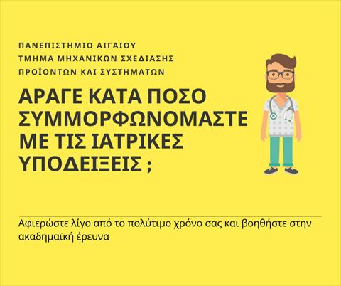 Το Μεταπτυχιακό Τμήμα Μηχανικών Σχεδίασης Προϊόντων και Συστημάτων του Πανεπιστημίου Αιγαίου διεξάγει έρευνα που αφορά την συμμόρφωση ασθενών στις ιατρικές υποδείξεις. Η έρευνα πραγματοποιείται πανελλαδικά με την συμμετοχή αρκετών ιατρικών συλλόγων και συλλόγων ασθενών. Στο παρακάτω link θα βρείτε το ηλεκτρονικό ερωτηματολόγιο που απαιτεί λίγα λεπτά από τον πολύτιμο χρόνο σας. Με την συμμετοχή σας συμβάλλετε ενεργά στον εμπλουτισμό της ακαδημαϊκής γνώσης. Παρακαλούμε θερμά αφιερώστε λίγα λεπτά.