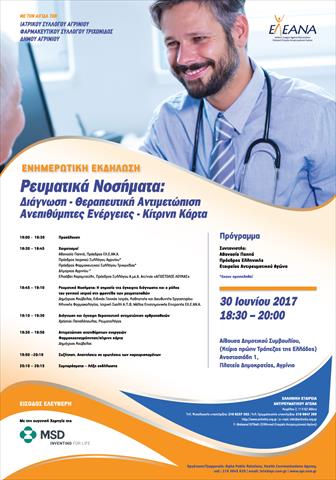Εκδήλωση ενημέρωσης και ευαισθητοποίησης του κοινού, των νοσούντων και των επαγγελματιών υγείας για τα ρευματικά νοσήματα με θέμα «Ρευματικά νοσήματα. Διάγνωση-θεραπευτική αντιμετώπιση, ανεπιθύμητες ενέργειες, κίτρινη κάρτα» οργανώνει η Ελληνική Εταιρεία Αντιρευματικού Αγώνα ( ΕΛ.Ε.ΑΝ.Α) στις 30 Ιουνίου 2017 και ώρες 18:00-20:30 στην Αίθουσα του Δημοτικού Συμβουλίου στο Κτίριο της πρώην Τράπεζας της Ελλάδος( Αναστασιάδη 1, Πλατεία Δημοκρατίας).