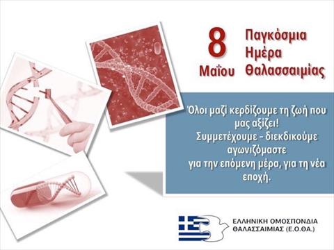 Η 8η Μαΐου έχει καθιερωθεί από τον Παγκόσμιο Οργανισμό Υγείας (Π.Ο.Υ.) και τη Διεθνή Ομοσπονδία Θαλασσαιμίας (T.I.F.) ως Παγκόσμια Ημέρα Θαλασσαιμίας...