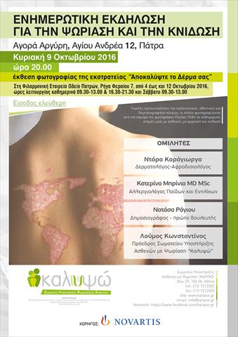 Επίσης, η πρωτότυπη έκθεση φωτογραφίας «Αποκαλύψτε το Δέρμα σας» στην οποία συμμετέχουν γνωστές προσωπικότητες, καθώς και ασθενείς με Ψωρίαση και Κνίδωση, θα φιλοξενηθεί στη Φιλαρμονική Εταιρεία Ωδείο Πατρών, Ρήγα Φεραίου 7, από 4 έως και 12 Οκτωβρίου 2016, ώρες λειτουργίας καθημερινά 09.30-13.00 16.30-21.30 και Σάββατο 09.30-13.00.