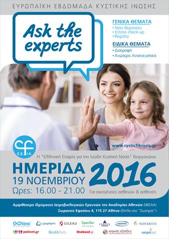 Περισσότερες πληροφορίες και το αναλυτικό πρόγραμμα μπορείτε να βρείτε στην ιστοσελίδα μας: http://www.cysticfibrosis.gr/el/νέα/τα-νέα-μας/814-ημερίδα-κυστικής-ίνωσης-2016-ask-the-experts