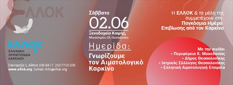 Η Ελληνική Ομοσπονδία Καρκίνου - ΕΛΛΟΚ, στο πλαίσιο του προγράμματος δράσης του 2018 διοργανώνει επιστημονική ημερίδα με τίτλο ”Γνωρίζουμε τον Αιματολογικό Καρκίνο” που θα πραγματοποιηθεί το Σάββατο 2 Ιουνίου 2018 στο ξενοδοχείο ΚΑΨΗΣ στην Θεσσαλονίκη.