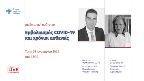 H Ένωση Ασθενών Ελλάδας διοργανώνει μία ενημερωτική εκδήλωση για τον εμβολιασμό COVID-19 στους χρόνιους ασθενείς, την Τρίτη 26 Ιανουαρίου 2020 στις 18:00, με κεντρικούς καλεσμένους το Γεν. Γραμματέα Πρωτοβάθμιας Φροντίδας Υγείας Μάριο Θεμιστοκλέους και την Πρόεδρο της Εθνικής Επιτροπής Εμβολιασμών και Ομότιμη Καθηγήτρια Παιδιατρικής Μαρία Θεοδωρίδου.
