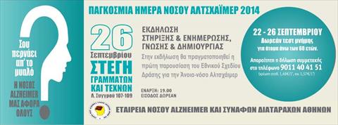 Με την ευκαιρία της Παγκόσμιας Ημέρας νόσου Αλτσχάιμερ (21 Σεπτεμβρίου) και την ολοκλήρωση της εκπόνησης του Εθνικού Σχεδίου Δράσης για την Άνοια, η Εταιρεία Νόσου Alzheimer και Συναφών Διαταραχών Αθηνών διοργανώνει σειρά εκδηλώσεων με σύνθημα: «Σου περνάει απ’ το μυαλό? Η νόσος Αλτσχάιμερ μας αφορά όλους». Την Παρασκευή 26/9 θα γίνει η πρώτη παρουσίαση του Εθνικού Σχεδίου Δράσης για την Άνοια και τη νόσο Αλτσχάιμερ, παρουσία επισήμων, φίλων, ασθενών και φροντιστών.