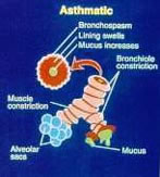 Στο βρογχικό άσθμα η βλάβη αφορά τους βρόγχους (1), δηλαδή τους σωλήνες μέσα από τους οποίους περνά ο αέρας για να φθάσει στους πνεύμονες. Οι βρόγχοι στενεύουν και έτσι εμποδίζουν την κυκλοφορία του αέρα στους πνεύμονες με αποτέλεσμα την πρόκληση βήχα, βρασίματος (χουρχουρητό), δύσπνοιας και σφυρίγματος (γατάκια).
