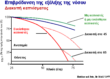 Σχήμα 1: Θετική επίδραση της διακοπής του καπνίσματος (διακεκομμένες γραμμές που δείχνουν ότι η κλίση της καμπύλης έκπτωσης ομοιάζει με αυτή των μη καπνιστών)
