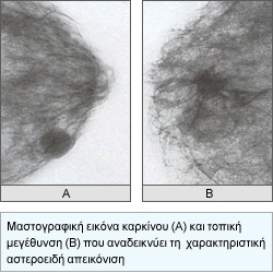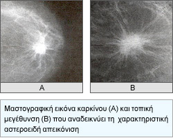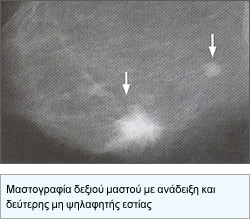 Τα κλασσικά σημεία καρκίνου στην μαστογραφία είναι οι ακτινοειδείς προσεκβολές στην περιφέρεια του όγκου και / ή η παρουσία συρρεουσών, λεπτών ή ποικιλόμορφων αποτιτανώσεων. Είναι βεβαίως πιθανό σε έναν αψηλάφητο καρκίνο στην μαστογραφία, να αναδειχθεί και ένας δεύτερος καρκίνος στον ίδιο ή στον άλλο μαστό.