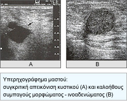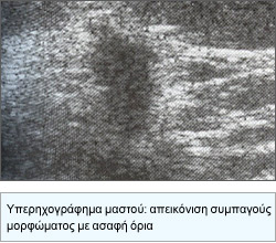 Συμπληρωματικό της μαστογραφίας στη διάγνωση είναι επίσης το Υπερηχογράφημα, το οποίο ελέγχει το περίγραμμα του όγκου (στην περίπτωση καρκίνου είναι ασαφές) και ιδιαίτερα το έγχρωμο υπερηχογράφημα, το οποίο μπορεί να καταδείξει αυξημένη αιμάτωση-αγγείωση της περιοχής στην περίπτωση καρκίνου.