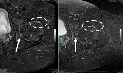 Μαγνητική τομογραφία ασθενούς πριν & 6 μήνες μετά από εμφύτευση αυτόλογων καλλιεργημένων μεσεγχυματικών κυττάρων στην άρθρωση του ισχίου για θεραπεία εκσεσημασμένης οστεοαρθρίτιδας. Με το διακεκομένο κύκλο φαίνεται η μείωση της υμενίτιδας και του οστικού οιδήματος του υποχόνδριου οστού της κεφαλής του μηριαίου, ενώ με τα βέλη φαίνεται η αύξηση του όγκου του χόνδρου στη φορτίζουσα επιφάνεια αυτής.