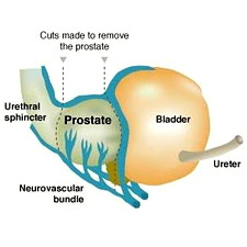 Στην κλασσική ριζική προστατεκτομή αφαιρείται η περιοχή που αναγράφεται “Prostate” μαζί με το μπλε χρώμα που αντιστοιχεί στο αγγειονευρώδες δεμάτιο.